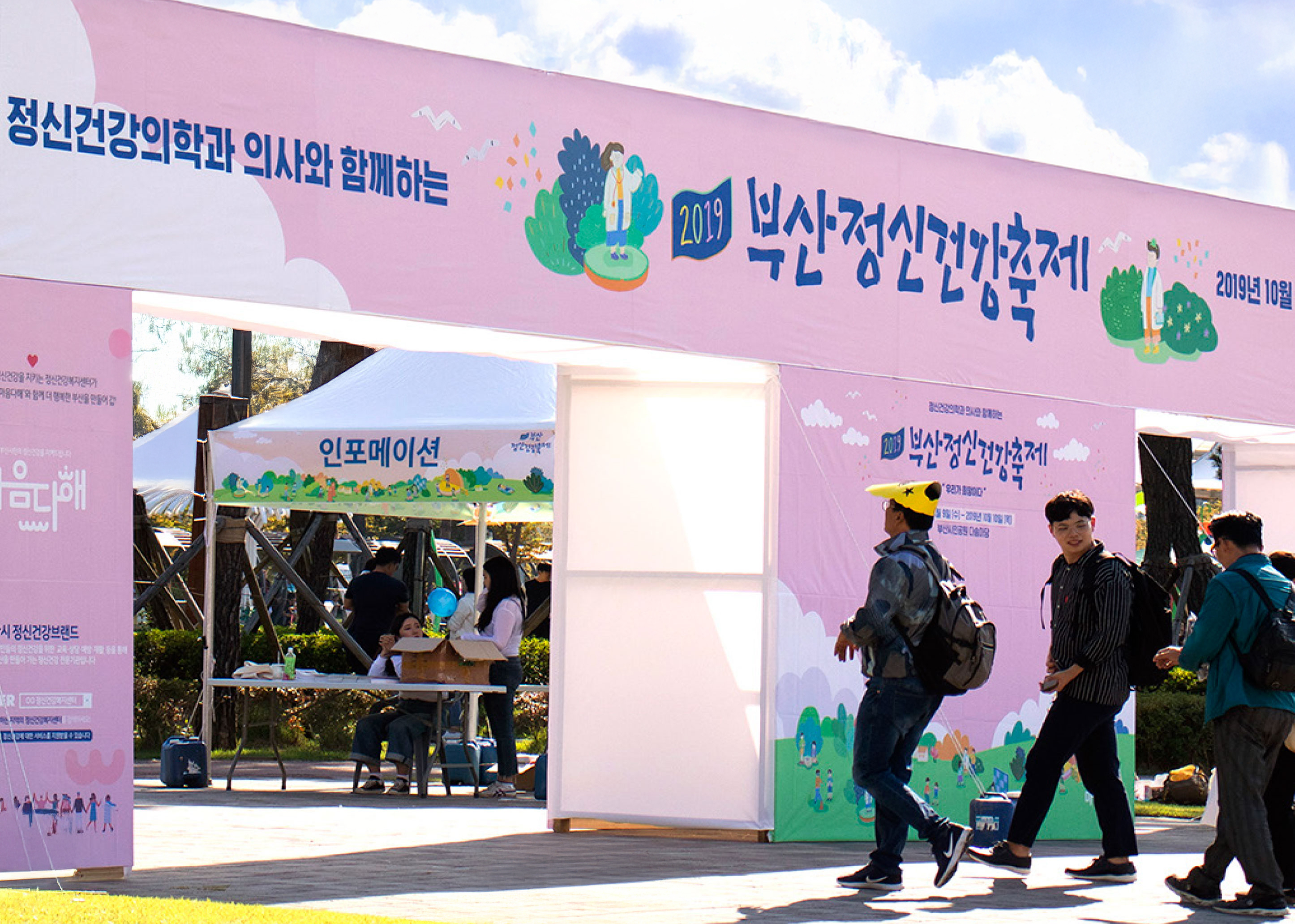 부산정신건강축제 행사는 정신건강에 대한 편견을 없애고 정신건강 증진과 인식개선에 기여하고자 만들어진 축제입니다. 행사는 전시관, 교육관, 체험관, 문화관, 상담관 등 총 5개관으로 구성되어 주제에 따라 시민들이 직접 참여할 수 있는 프로그램 및 공연으로 진행됩니다. 각 부스의 장면들을 축제 분위기에 맞는 따뜻한 파스텔 톤의 컬러를 사용하여 키비주얼 일러스트레이션을 작업하였습니다. 중요 이벤트 장면들과 부산시민공원의 장소성 이미지가 잘 드러나고, 시민들이 친근하게 다가올 수 있는축제의 산뜻한 장소와 분위기 및 다양한 인물들을 연출하였습니다.